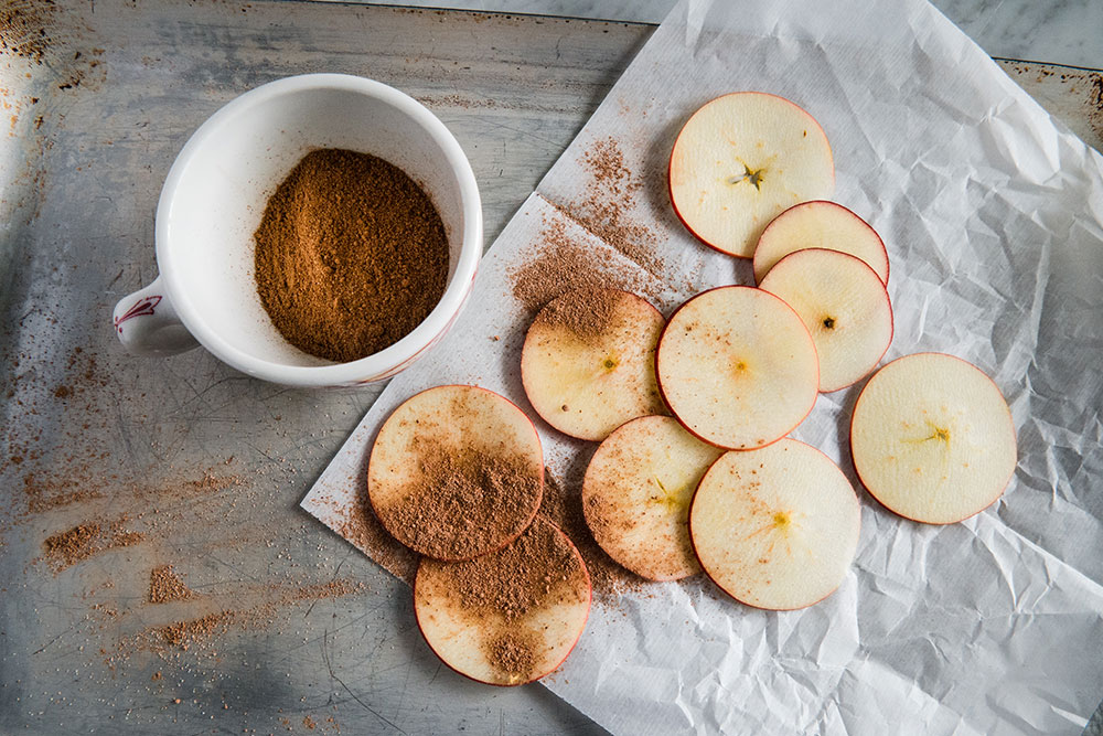 5. On a clean work surface, lay the apple slices flat. Dust one side with the spice mixture and transfer to the lined sheet pans. The slices can be close together but should not overlap.